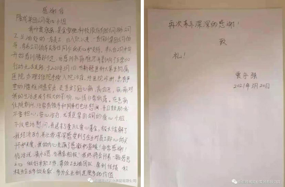 新疆金雪馳科技股份有限公司烏魯木齊分公司工業(yè)油處處長賈永強,自2021年3月1日起,因身體抱恙,住院治療,據(jù)了解身體情況較為嚴(yán)重(腰間盤突出、冠心病、心臟驟停)。家中父母年邁均退休,父親癱瘓在床多年,家中還背負(fù)著房貸,作為家中的勞動力和頂梁柱,壓力巨大。賈永強對工作恪盡職守,悉心教導(dǎo)帶領(lǐng)的隊伍,對處室人員起到了積極的模范帶頭作用。他堅守崗位,直到做好后續(xù)工作交接才放心去住院治療。愛心基金小組深入了解情況后,相關(guān)部門積極跟進愛心基金捐助工作,于2021年3月19日向正在接受住院治療的賈永強電匯金雪馳愛心基金10000元。希望他積極接受治療,好好養(yǎng)病,早日康復(fù)出院,重回工作崗位,回歸隆成大家庭。